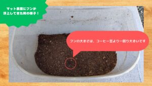 マットの水分量は、マットを握って形が崩れない程度に水分を含ませます。マットを濡らしすぎるとカビや有害なバクテリアが繁殖し、幼虫の健康を害する恐れがあります。